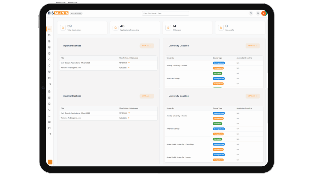 At BIS Agents, we believe in building strong partnerships between leading universities and qualified education agents to help students find the best academic opportunities worldwide. Our platform simplifies the recruitment process, enhances communication, and ensures that both institutes and agents can work together efficiently to place students in their dream institutions.